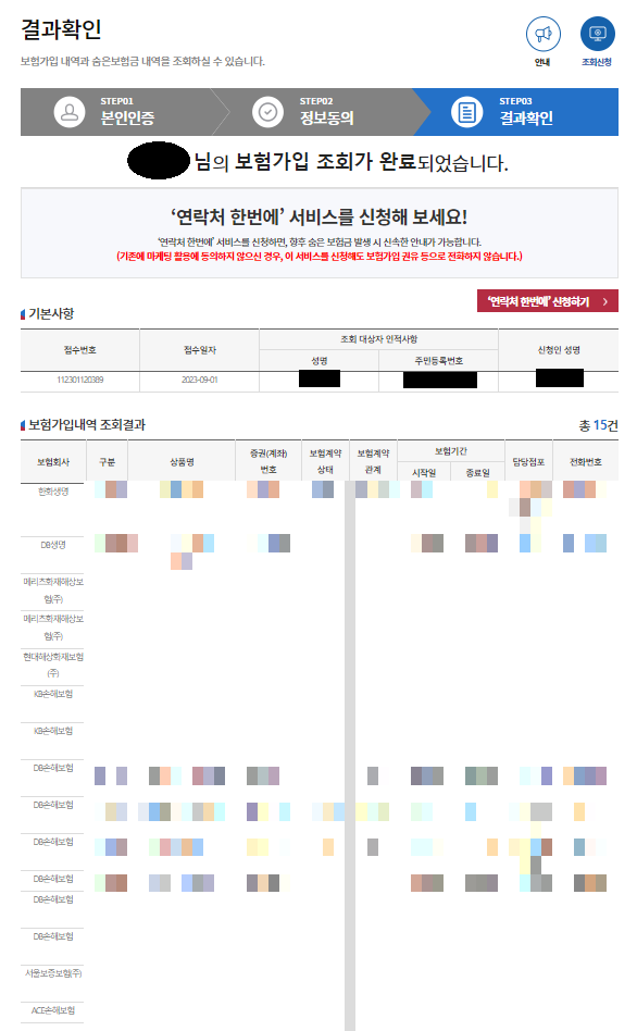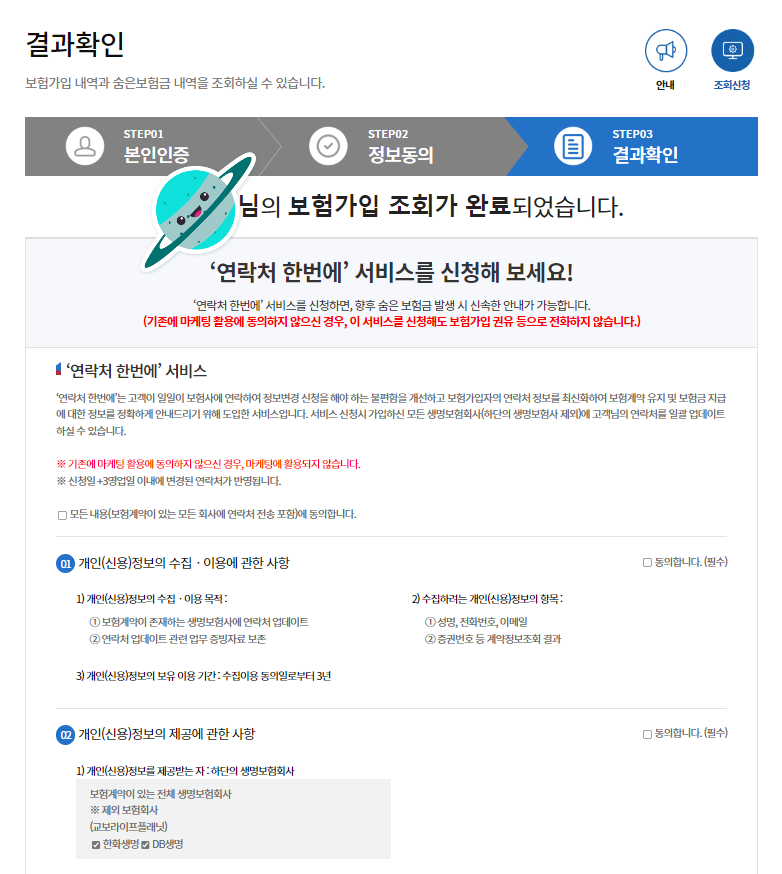자신이 가입한 보험상품을 확인한 뒤에 빨간색 배경으로 된 '연락처 한번에' 신청하기를 누르면 아래 오른쪽 페이지로 넘어가고요. 여기서 필수 사항에 '동의합니다'를 누르고 아래 파란색 '확인' 버튼을 누르면 보험사에서 직접 연락해 보험금 수령 절차를 진행합니다.