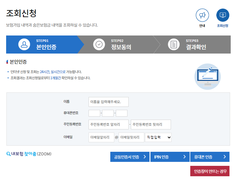 숨은 보험금을 찾기 위해서는 내보험찾아줌 사이트에 접속해야 합니다. 생명보험협회와 손해보험협회가 운영하는 사이트인데요. 이곳에서 자신이 가입한 모든 보험계약과 숨은 보험금을 한번에 확인할 수 있습니다.