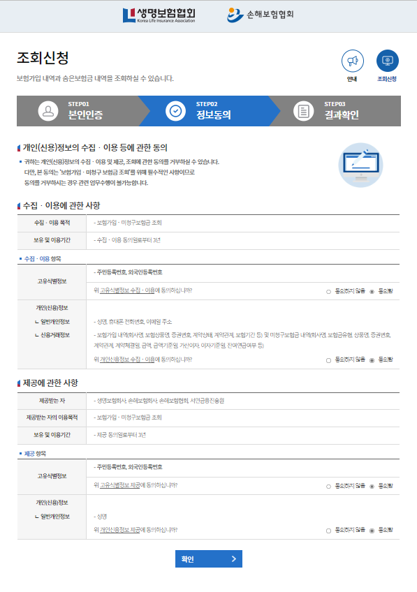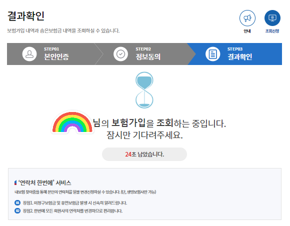 인증절차를 모두 마쳤으면, 화면이 '정보동의'로 바뀝니다. 모두 '동의함'을 눌러주시고, '확인'을 누르면, 아래 오른쪽과 같은 화면이 뜹니다. 약 30초 정도 걸리는데, 인터넷 속도와 접속자 수에 따라 시간이 좀 더 걸릴 수도 있습니다.