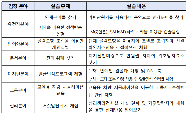 2) 과학적 원리가 범죄 수사와 법과학 감정에 어떻게 이용되는지 이론과 실습을 통해 체험