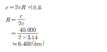 당시 측정한 지구의 둘레 값은 오늘날의 측정치 4.0*10000km에 비하여 약 15%가 크지만 당시의 기술로서는 놀랄만큼 정확한 값입니다. 오늘날의 값에서 지구의 반지름 R를 구해 보면 다음과 같습니다.