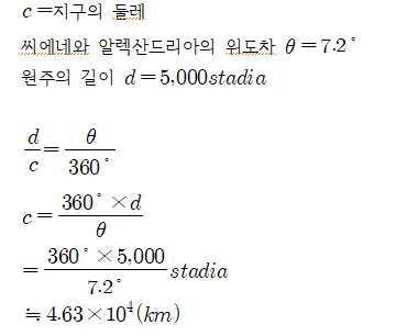 에라토스테네스(Eratosthenes, B.C. 276-194)는 지구의 모양이 구라고 생각하고 그 둘레를 처음으로 측정한 수학자입니다.나일강의 동편 북회귀선에 가까운 씨에네에서는 하지가 되면 정오에 태양이 머리 위에 오며, 태양의 영상이 깊은 우물의 수면 가운데에 됩니다. 같은 하짓날 정오에 씨에네와 거의 동일 자오선상의 북쪽에 있는 알렉산드리아에서는 태양이 천정에서 7.2도의 각도만큼 남쪽에 있게 됩니다. 알렉산드리아에서 씨에네까지의 거리는 5,000stadia(1stadia는 약 185m)이었습니다. 이와 같은 관측에서 에레토스테네스는 다음과 같이 지구의 둘레를 계산합니다.