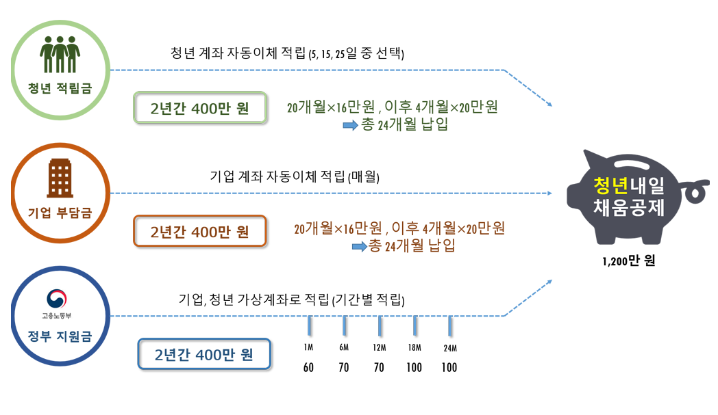 청년 본인이 2년 동안 400만 원을 적립하면, 기업과 정부가 각각 400만 원씩 공동 적립해서 2년 뒤에는 만기공제금 1,200만 원에 알파를 더해서 지원하는 방식입니다. 사회 초년생 입장에서는 2년간 400만 원만 내면 최소 1,200만 원 이상의 목돈을 마련할 수 있는 셈입니다.