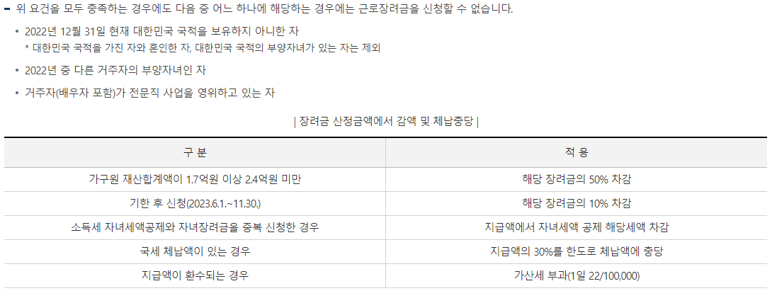 가구원 구성에 따라 2022년 부부합산 총소득금액이 기준금액 미만이어야하며, 총 급여액 등에 의하여 장려금을 산정합니다.