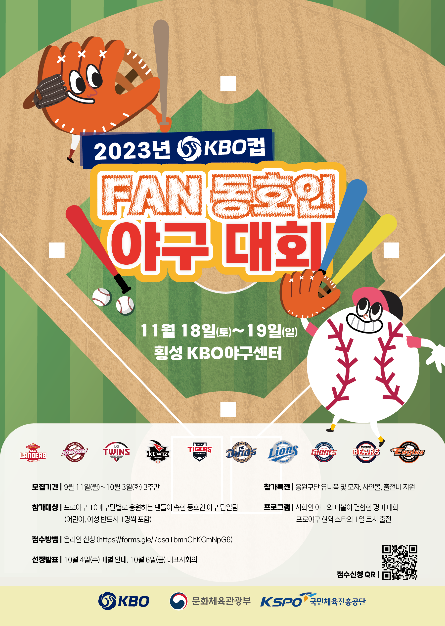 KBO컵 FAN 동호인 야구대회 참가하려면 10월 3일(화)까지 KBO 홈페이지를 통해 접수해야 합니다. 신청 링크(구글폼)를 작성한 뒤 발송하면 됩니다. 구단 연구지역 팬클럽이면서 동호인 야구리그에 참여하는 팀이라면 누구나 응모할 수 있고요. KBO는 각 팀이 제출한 사연을 바탕으로 심사해 10개 참가팀을 선발할 계획입니다.
